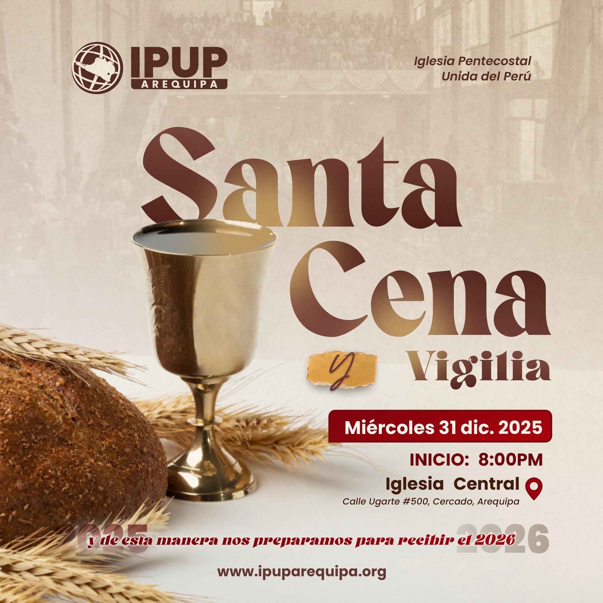 IPUP Arequipa, Cercado Calle Ugarte 500, Cercado, Arequipa🔥 SANTA CENA y VIGILIA 🔥 📆 Fecha: 31 de diciembre 2025. Hora: 08:00 pm en adelante. 📍 Lugar: Iglesia Central, calle Ugarte #500, Cercado. Sera una noche llena de: La Palabra de Dios. Alabanzas. Especiales. Tiempo de Compartir. Acompáñanos al lavamiento de pies.